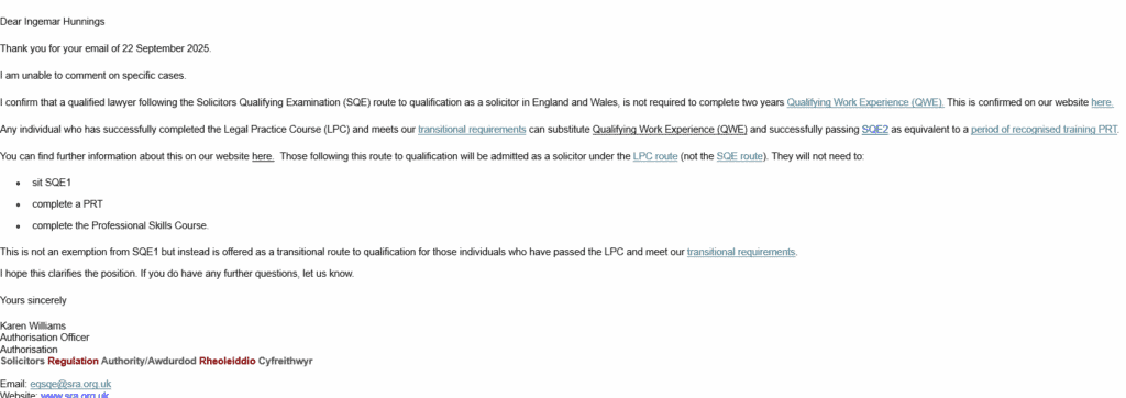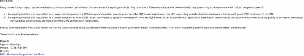 b) if you use a pass of the old LPC exam to obtain an exemption from the SQE1 exam, you will NOT be exempt from the QWE requirement, even if you are a qualified lawyer.