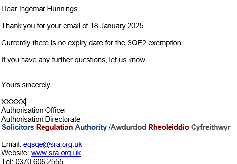 We asked the SRA if the SQE2 exemption, once granted has an expiry date. We have been asked this several aspiring solicitors. They have written to us to say that it does NOT expire.